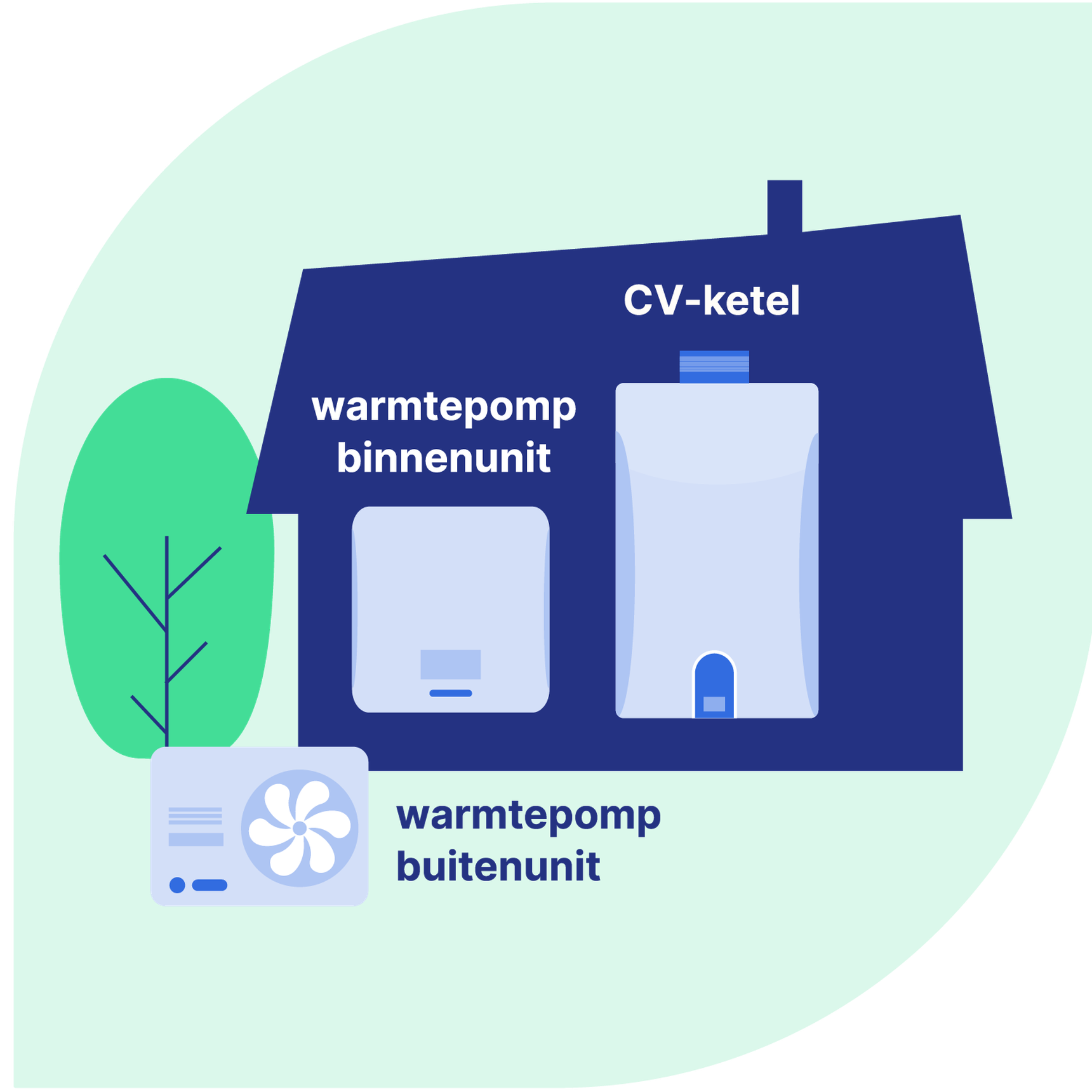 Een hybride systeem combineert een warmtepomp met een traditionele cv-ketel (gas, en eventueel stookolie). De warmtepomp levert het grootste deel van de warmte wanneer de buitentemperatuur het toelaat, en de ketel springt bij bij kou of hoge vraag. Er is vaak een slimme regeling zodat automatisch gekozen wordt welke warmtebron het voordeligst is. Zo blijft je huis verwarmd zonder comfortverlies.