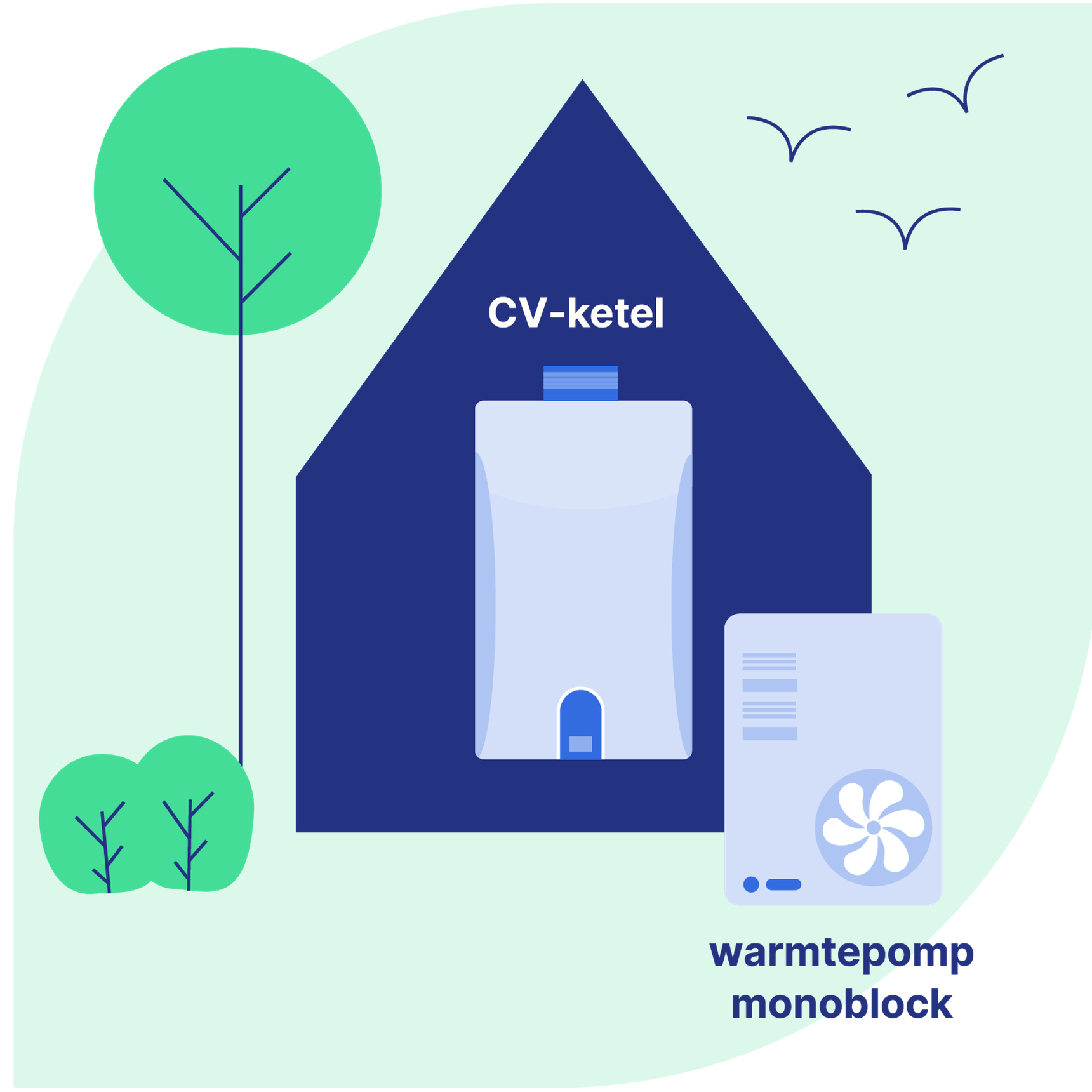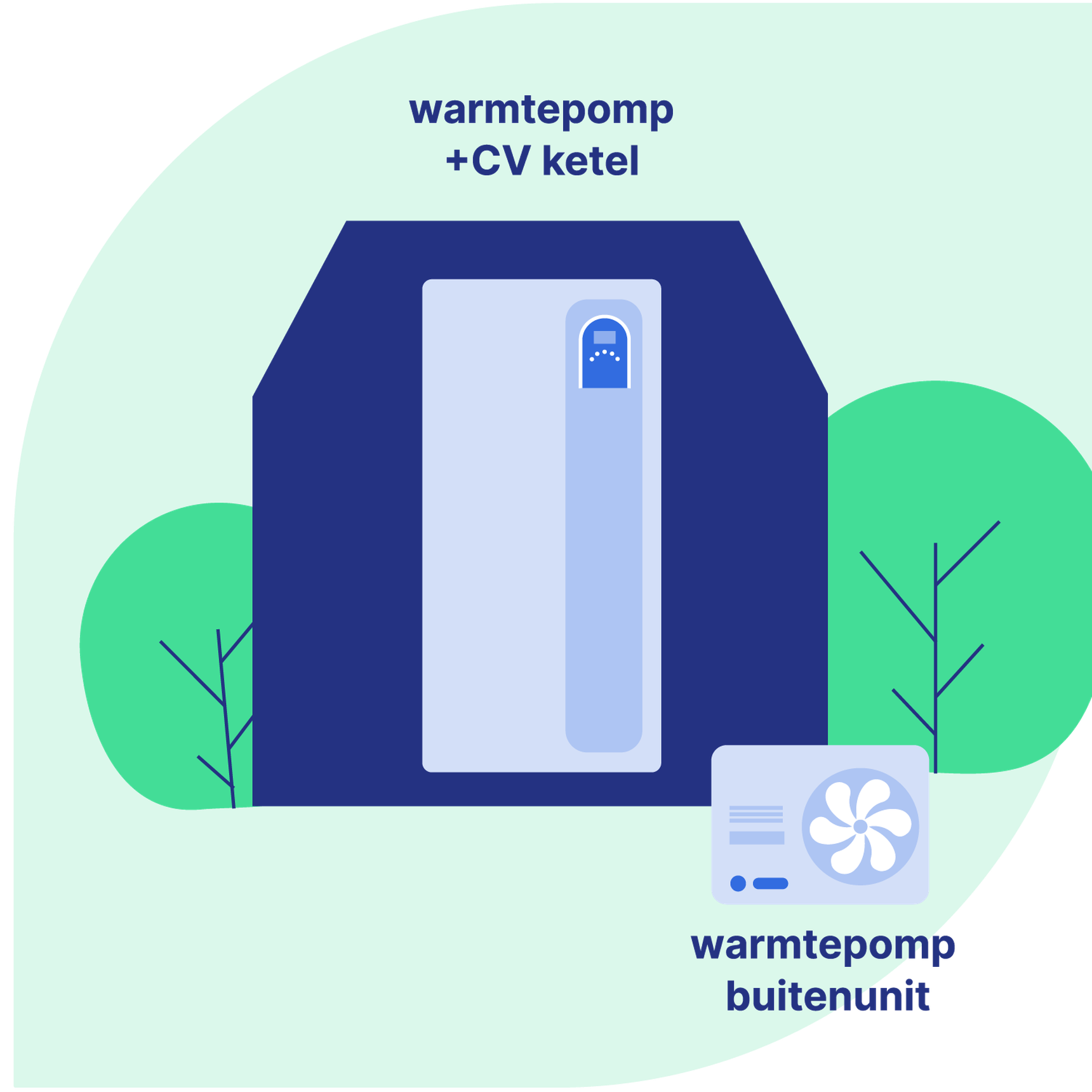 Hybride warmtepomp: combineert een warmtepomp met een cv-ketel. Werkt efficiënter bij milde tot matige temperaturen; ketel springt bij bij extreme kou. Volledig elektrische (all-electric) warmtepomp: vervangt volledig de cv-ketel. Vereist vaak betere isolatie, geschikt afgiftesysteem, en hogere investering. De hybride oplossing is in veel gevallen beter haalbaar voor bestaande woningen, juist omdat de ingrepen minder groot zijn en de investering vaak lager.